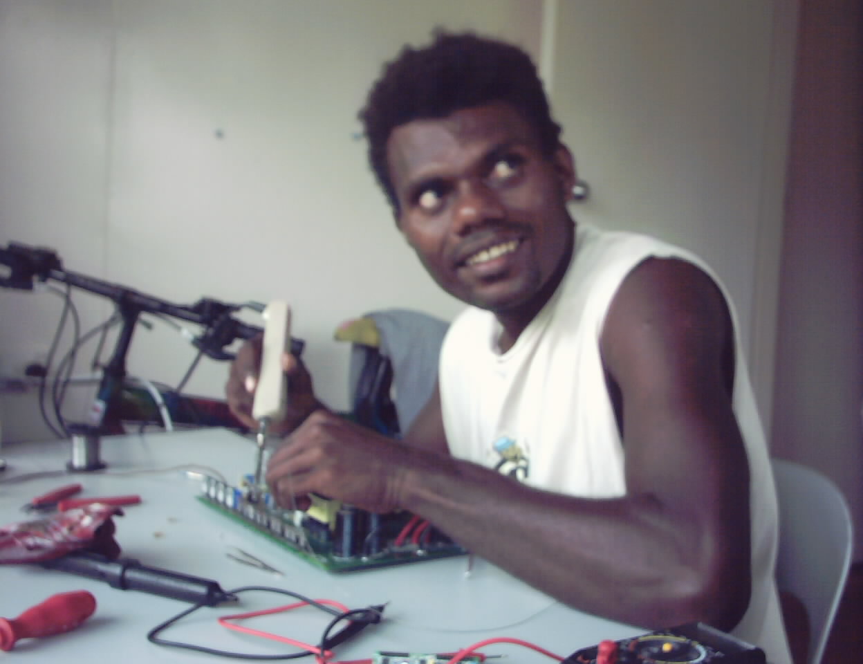 Ligurane in Papua New Guinea, who is doing excellent work soldering the fine CPU-modules. And he is doing it in the rain-forest just with Solar energy!